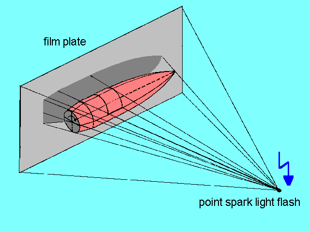The bullet, passing at a close distance in front of a photographic film plate is illuminated by a short duration light flash, which must be concentrated in a point. The flash can be triggered by a light barrier for example. No camera or optical lens is required for this technique. The shadowgraph displays the flowfield structure in the vicinity of the moving body.