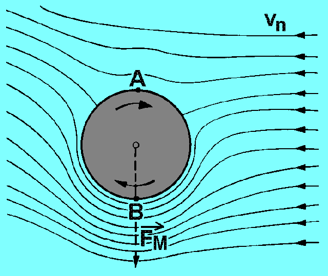 Due to bullet spin and air molecules adhering to the bulletīs surface, the flowfield in the vicinity of the bullet becomes asymmetric. Air stream velocity and the rotational velocity of the body subtract at point A and add at point B (see above figure). However, according to Bernoulliīs rule (see any elementary physics book), this coincides with a pressure difference. A higher pressure at A and a lower pressure at B give rise to a downward directed force, which is called the Magnus force FM .